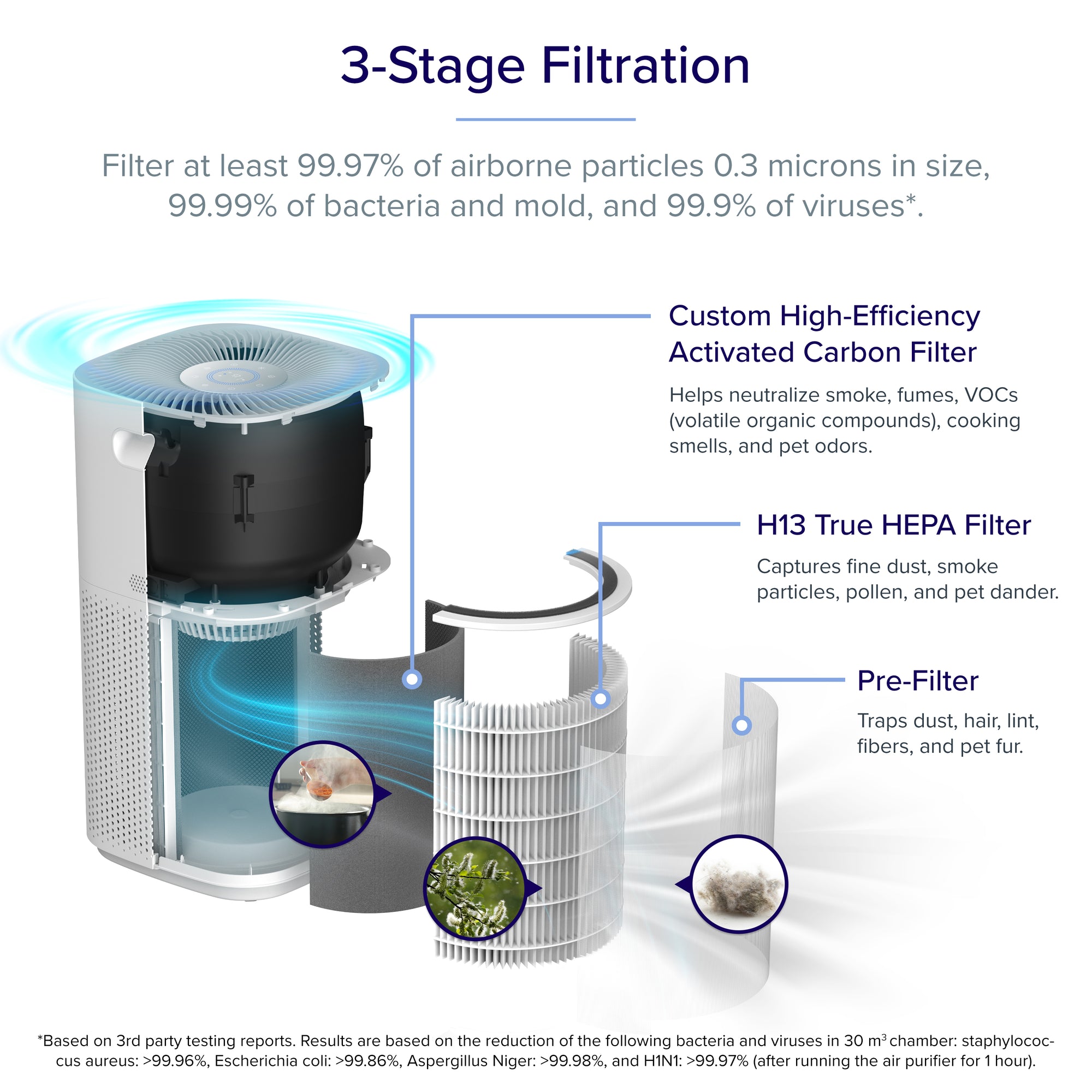 Filter at least 99.97% of airborne particles 0.3 microns in size, 99.99% of bacteria and mold, and 99.9% of viruses.