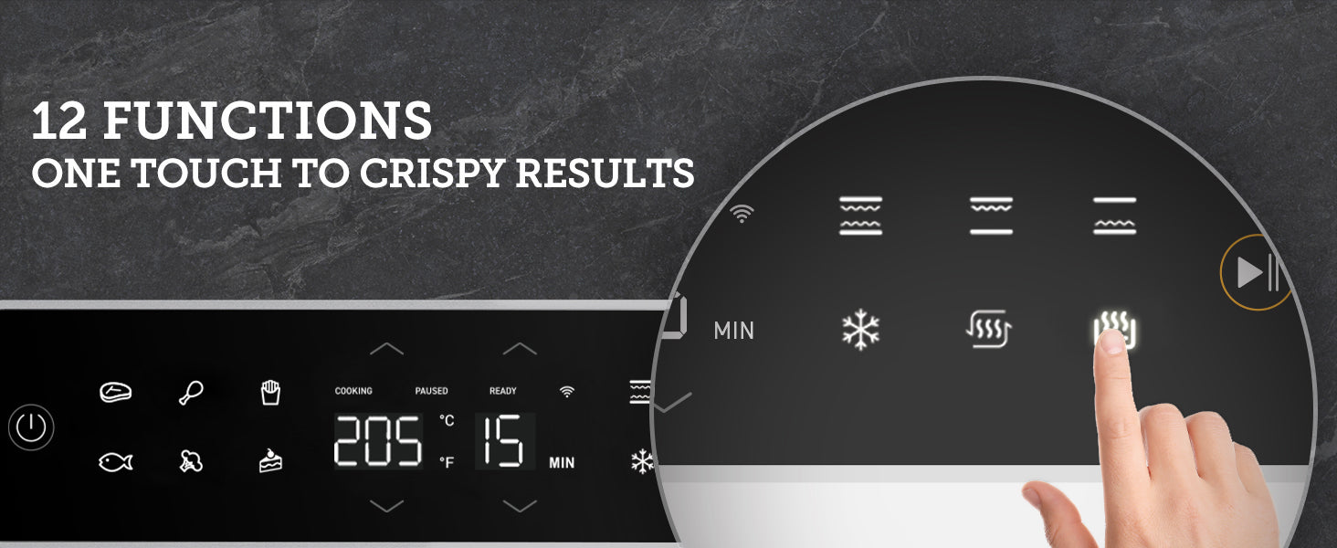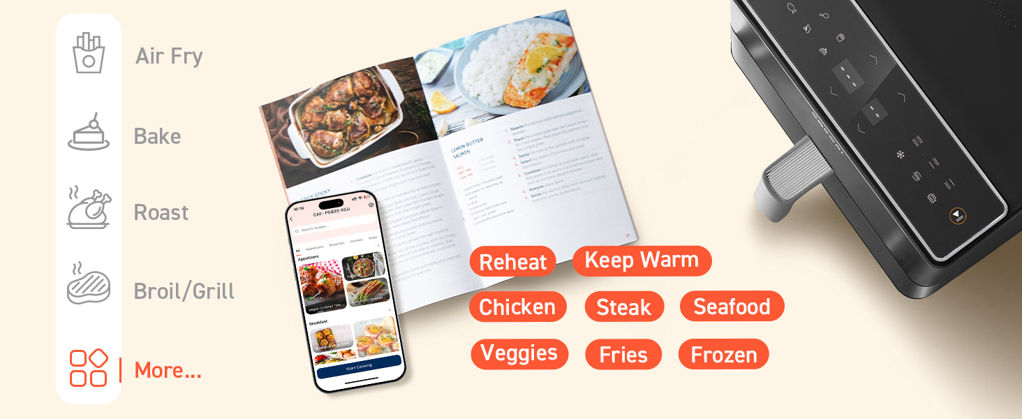 - 12 Functions: Chicken, Steak, Seafood, Veggies, Fries, Frozen, Air Fry, Reheat, Broil, Roast, Bake, and Keep Warm.