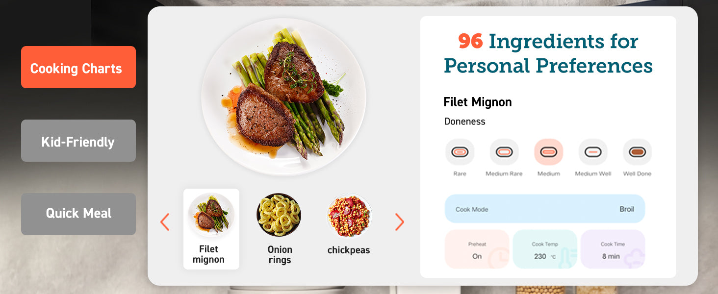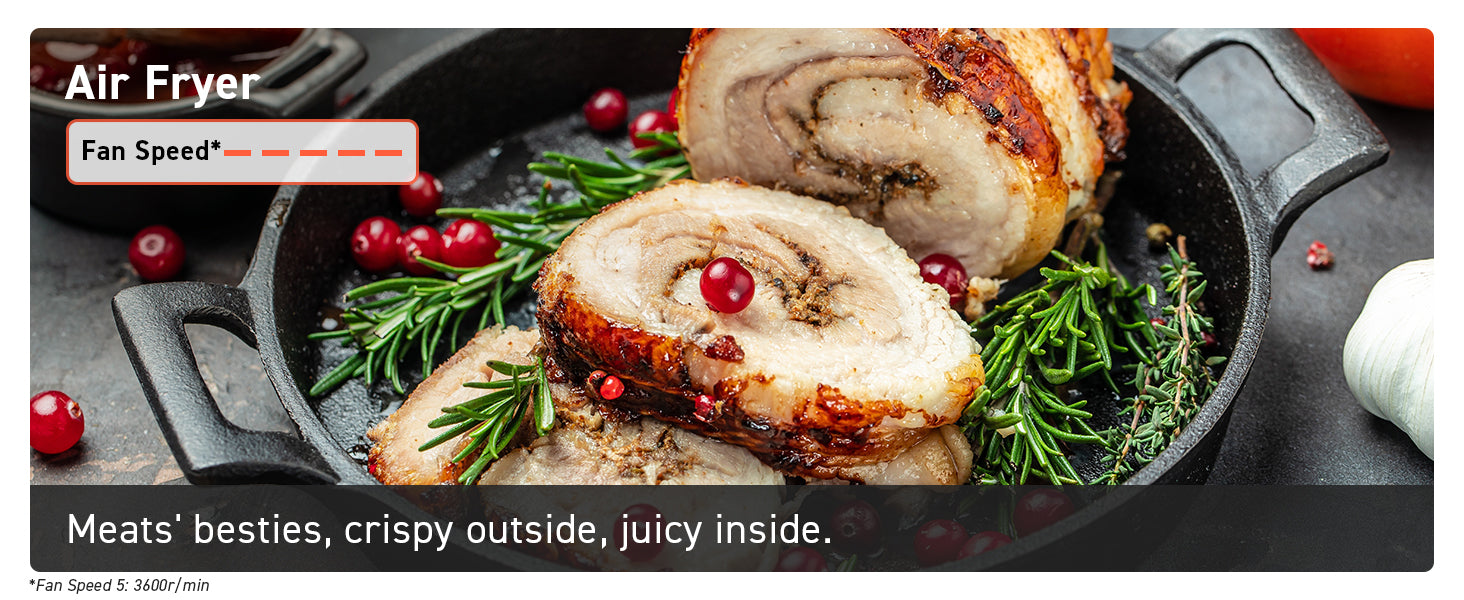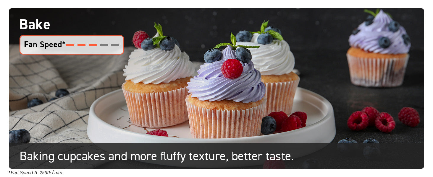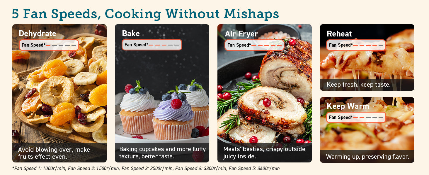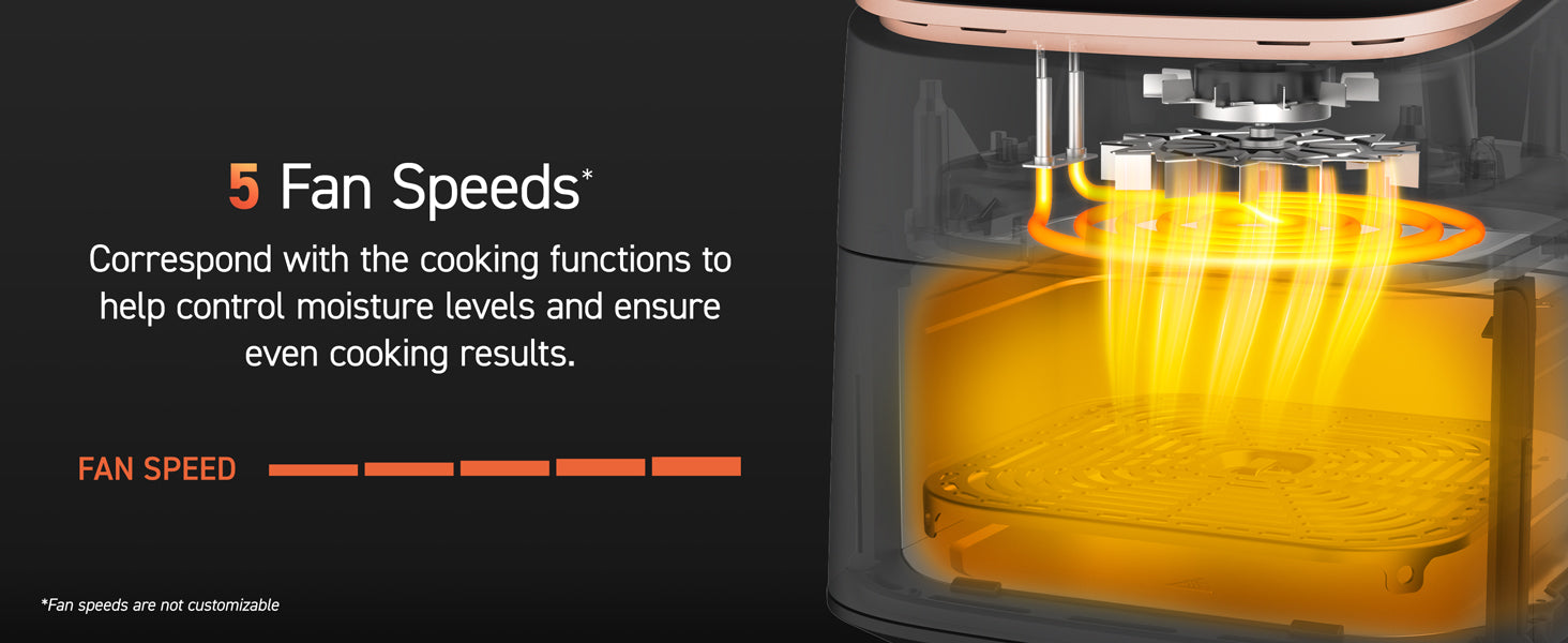- 5 Fan Speeds: Correspond with the 9 cooking functions to help control the food’s moisture levels and ensure even cooking results (not customizable).