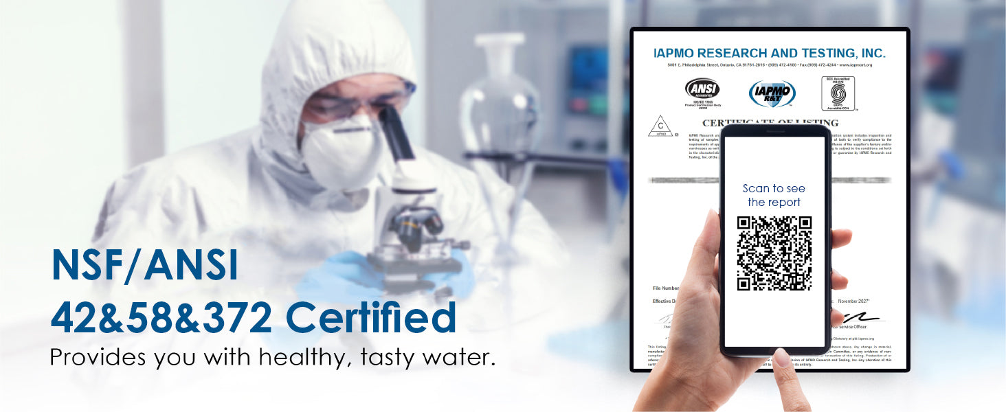 - Tested and certified by NSF/ANSI 58 for TDS reduction and NSF/ANSI 372 certified for lead-free material.
